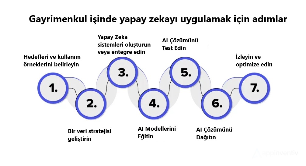 Gayrimenkul sektöründe yapay zekanın uygulanmasıyla otomasyonun sağlamak, potansiyel faydalarını maksimize etmek için yapılı bir yaklaşım gerektirir. Yapay zekayı gayrimenkul sektörüne entegre ederek, işletmeler rekabetçi kalabilir, kişiselleştirilmiş hizmetler sunabilir ve büyümeyi ve verimliliği artırmak için veri odaklı kararlar alabilir. Gayrimenkul sektöründe yapay zekayı uygulama adımlarına bir göz atalım.